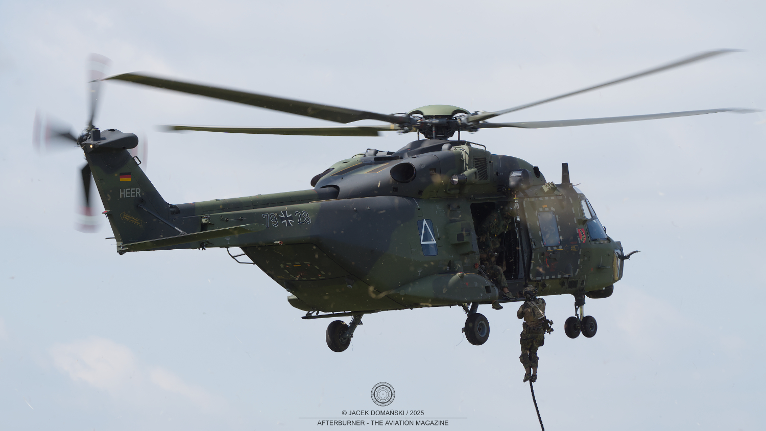 As usual, the 2025 edition of Tag der Bundeswehr featured two blocks of dynamic displays. The main part of the show was based on an anti-terrorist scenario involving several combat rotorcraft and an assault operation conducted by a German SOF unit. In addition, solo flying displays were performed by the EC665 Tiger, the CH-53G, the NH90 TTH, the EC135T3 and the H145M LUH SAR helicopters.