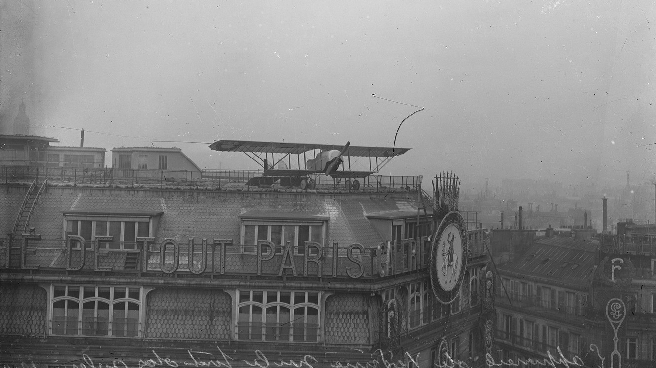 Shortly after the end of the Great War, the French department store Galeries Lafayette announced an unusual and dangerous aviation challenge. The aim was to land an aircraft on the twenty-eight by twelve metre terrace on the roof of the main Galeries Lafayette building on Boulevard Haussmann in Paris. Almost immediately, the challenge was banned by the Paris authorities because of the significant safety risk involved.