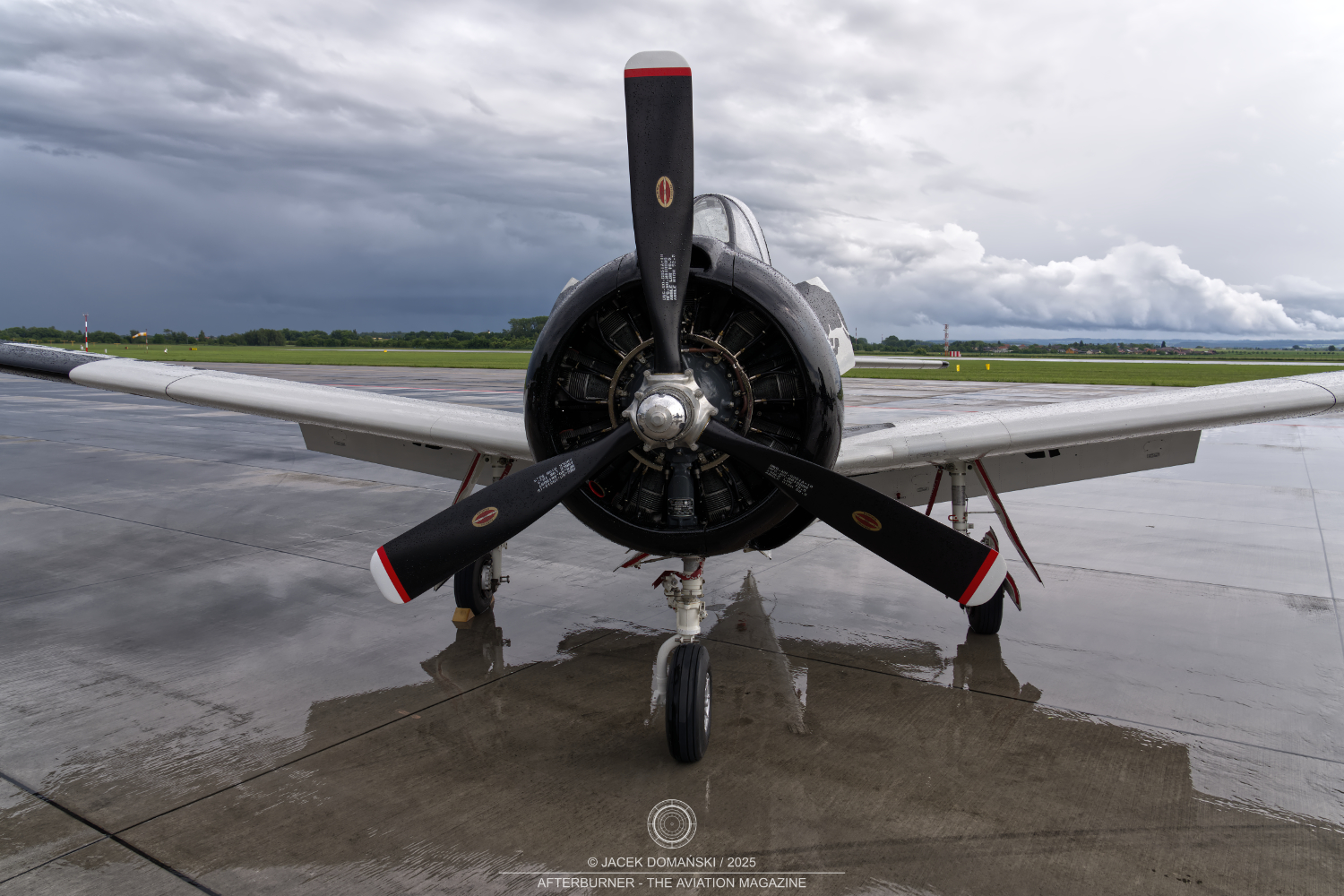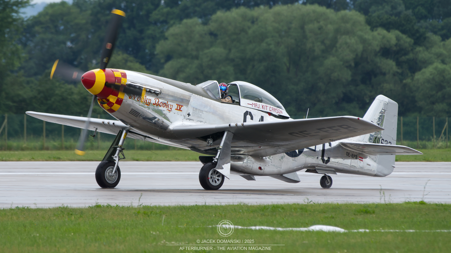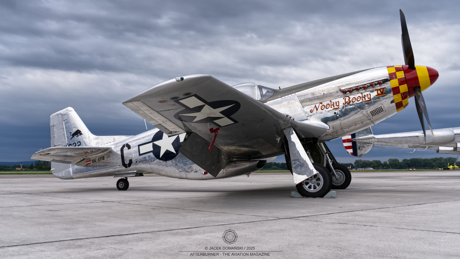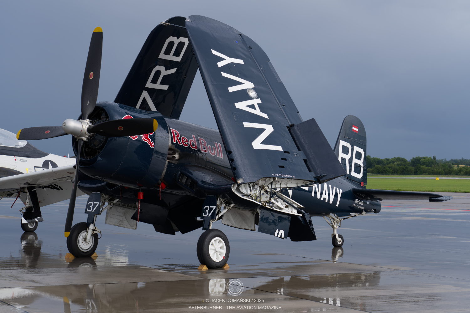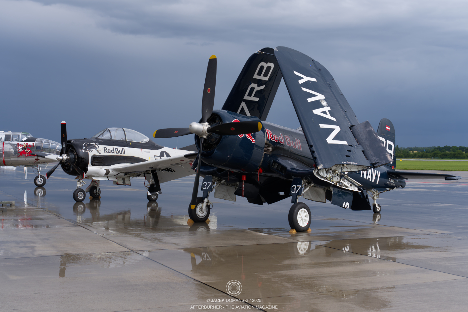 The world-renowned Flying Bulls collection from Hangar 7 in Salzburg has been a key participant in the event for many years. Despite the weather, the team arrived in Pardubice with a formation of five warbirds: a North American B-25J Mitchell, a Lockheed P-38L Lightning, a Chance Vought F4U-4 Corsair, a North American T-28B Trojan, and one of the team’s latest acquisitions – the North American P-51D Mustang “Nooky Booky IV”.