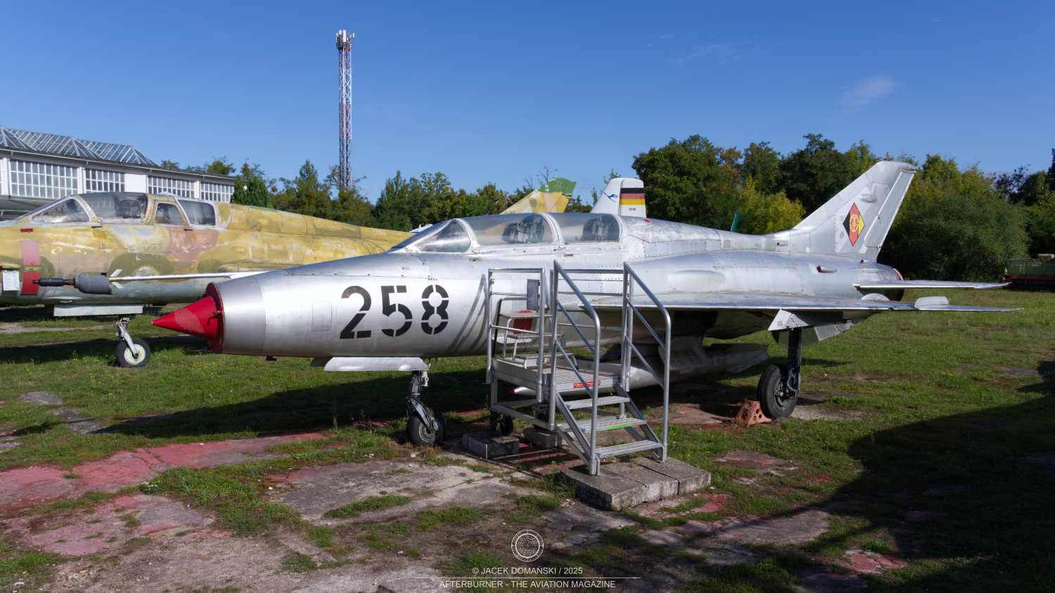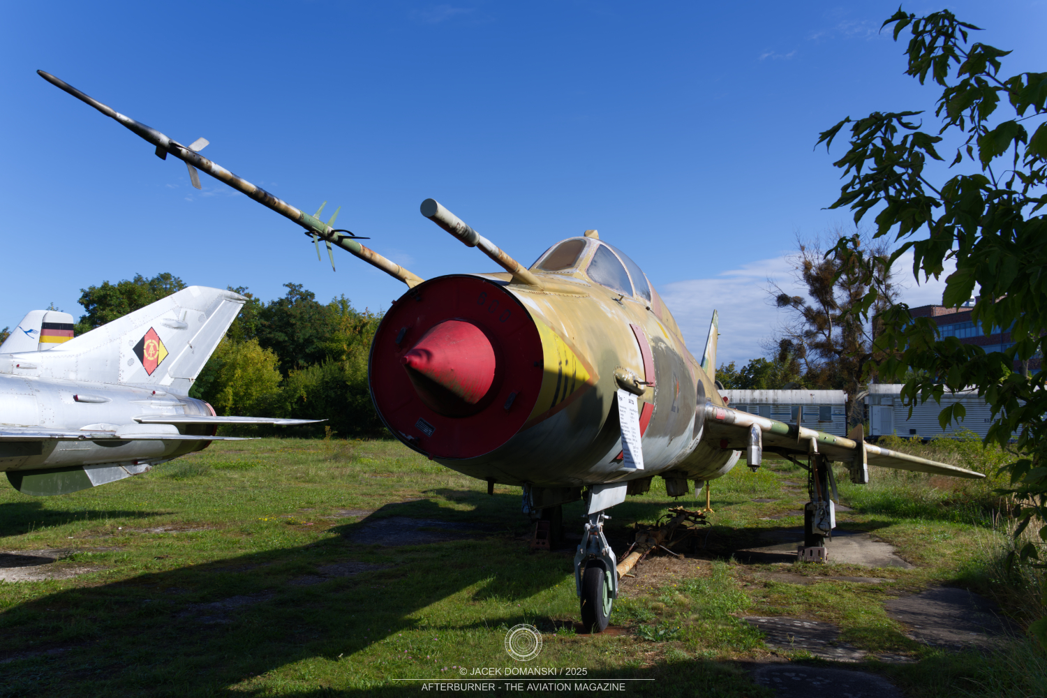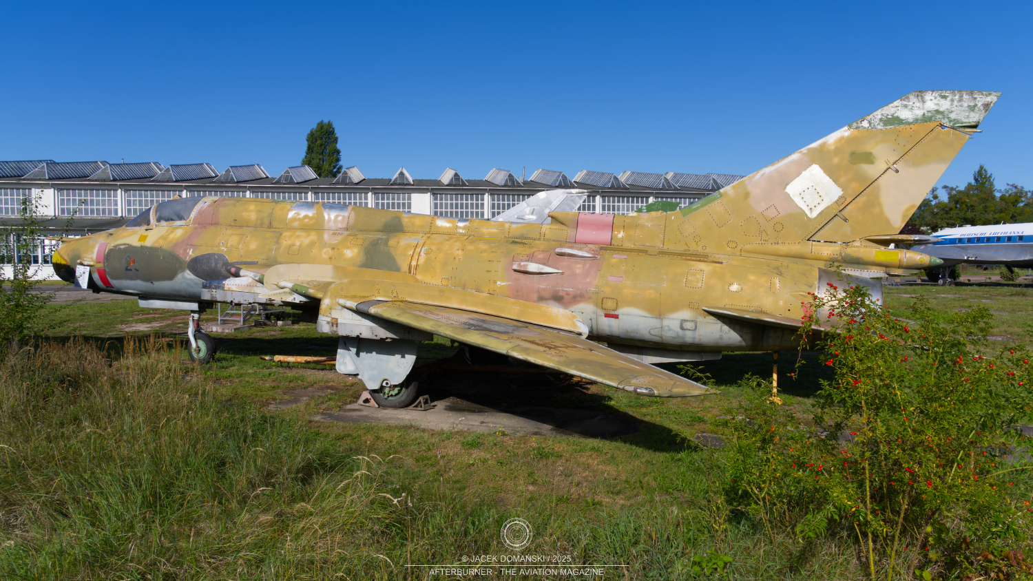 Outside the museum building there is an interesting open-air exhibition of Cold War combat aircraft, formerly operated by Luftstreitkräfte der Nationalen Volksarmee (the Air Forces of the National People’s Army). The collection includes the MiG-23MF, the MiG-21U-400, the Su-22M4 and the Su-22UM3K. Nearby, visitors can find the East German variant of the popular Soviet twin-engine Ilyushin Il-14P airliner, bearing the striking livery of Deutsche Lufthansa (the predecessor of Interflug) and the airframe of a Sud-Est SE-3130 Alouette II helicopter.