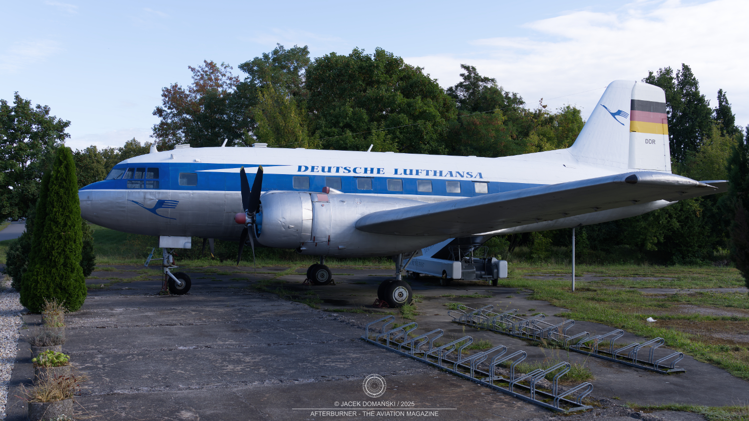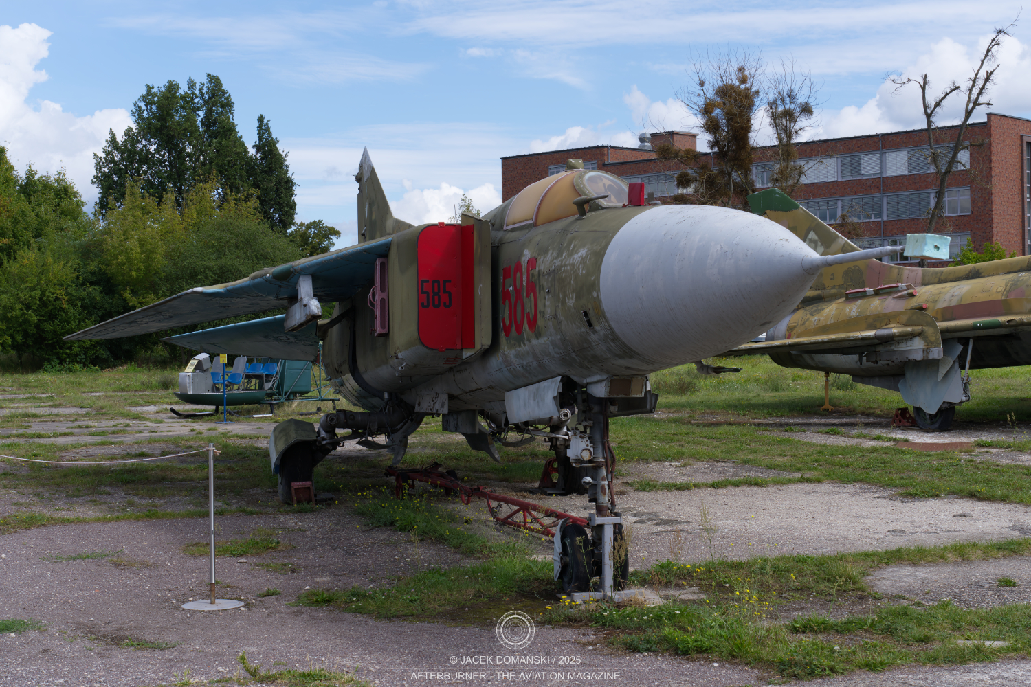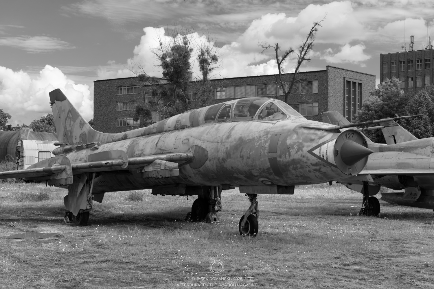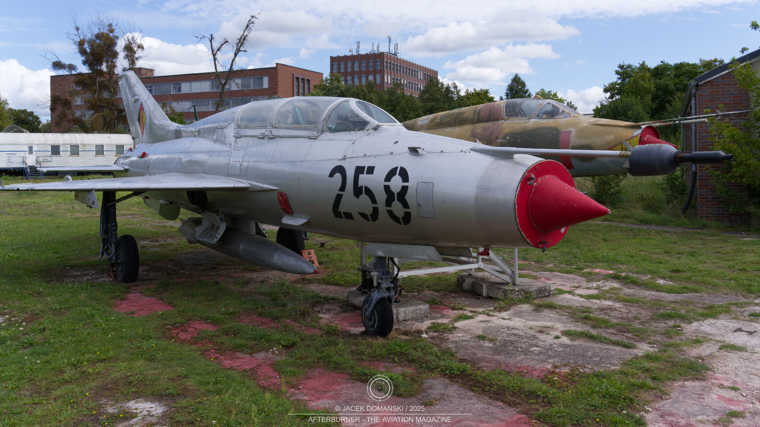 Outside the museum building there is an interesting open-air exhibition of Cold War combat aircraft, formerly operated by Luftstreitkräfte der Nationalen Volksarmee (the Air Forces of the National People’s Army). The collection includes the MiG-23MF, the MiG-21U-400, the Su-22M4 and the Su-22UM3K. Nearby, visitors can find the East German variant of the popular Soviet twin-engine Ilyushin Il-14P airliner, bearing the striking livery of Deutsche Lufthansa (the predecessor of Interflug) and the airframe of a Sud-Est SE-3130 Alouette II helicopter.